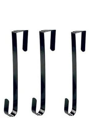 Pack of 6 Black Metal Wreath Hangers. Each is 13.25″ long x .6″ wide. This high quality yet inexpensive hanger can be used to hold wreaths or garlands on your doors. This hook will easily fit over interior or exterior doors, eliminating the need for screws and nails. Also sold singly.