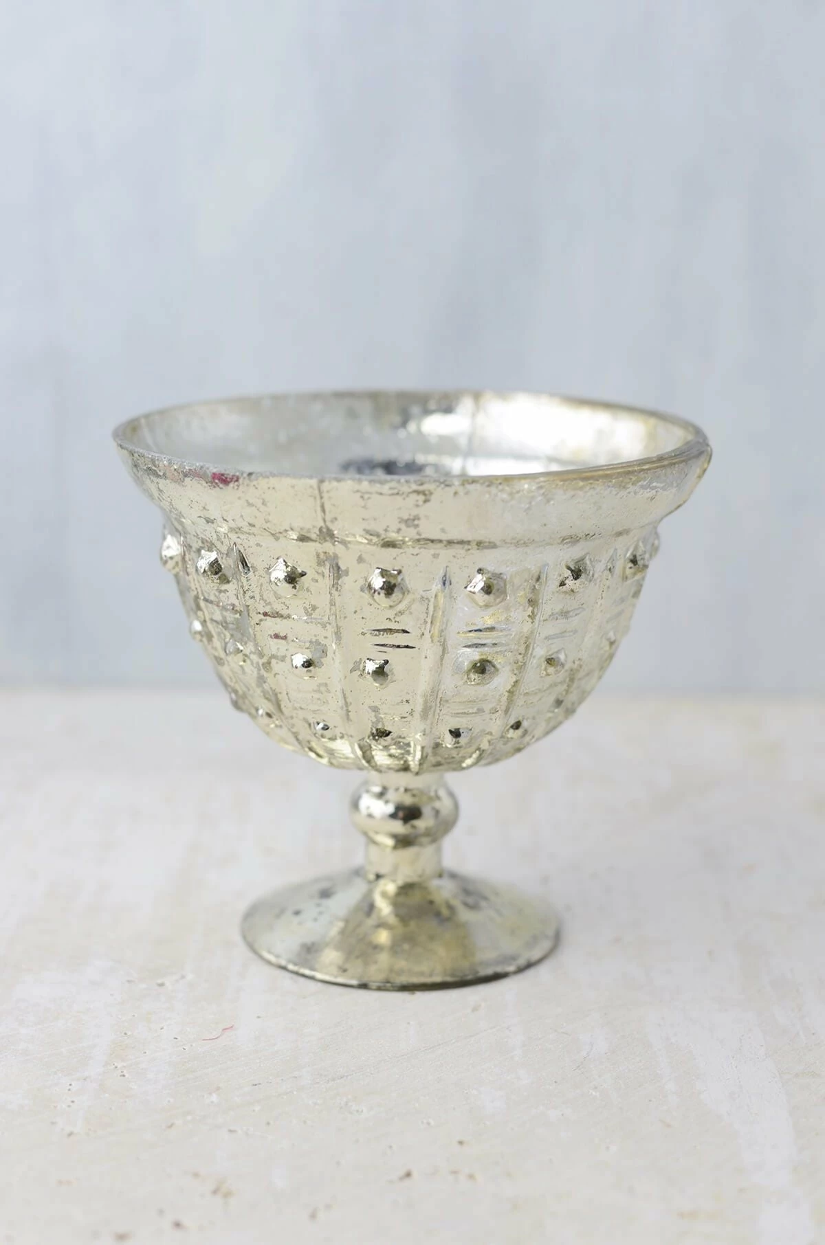 Bring some Renaissance flair to your home or event with this silver Glass Baleri Compote Bowl 6” x 5”. This enchanting bowl has a slightly distressed antique-look warm silver coating on the outside that allows some light to shine through which is perfect for small candles. The raised textured design adds effortless interest to any setting – just add your favorite brightly-colored blooms to create elegant displays!
