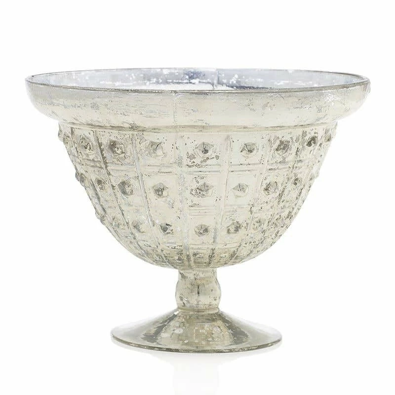 Bring some Renaissance flair to your home or event with this Glass Baleri Compote Bowl 8” x 6”! Fill with pale pink and white flowers for a romantic look, or for dramatic, Medieval style, use red and deep purple roses accented with natural branches. Pair this elevated warm silver vessel with cathedral candles for a tablescape that glows. This piece has a worn, antique-look coating on the outside that allows some light to shine through; and a raised texture design for added interest.Â