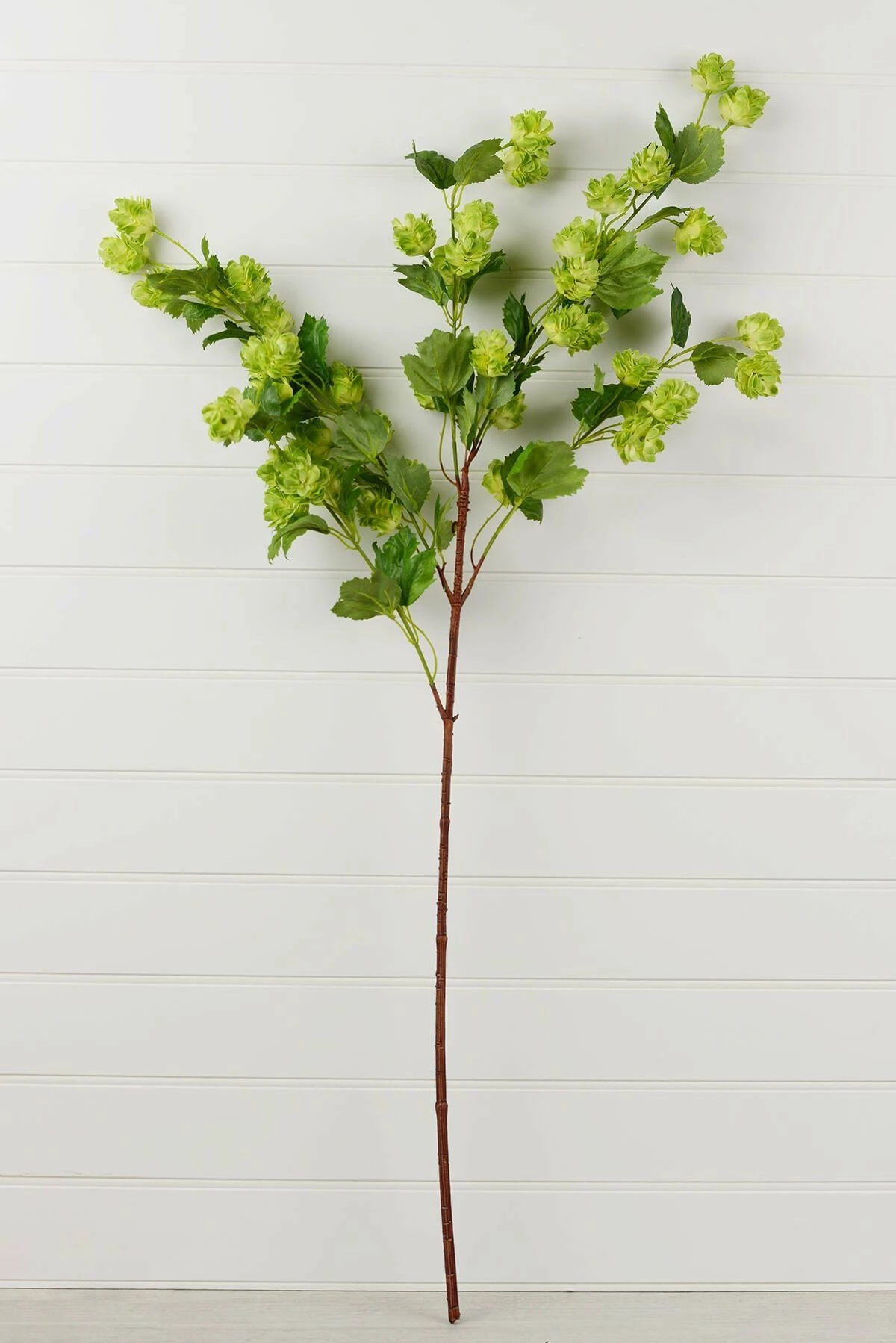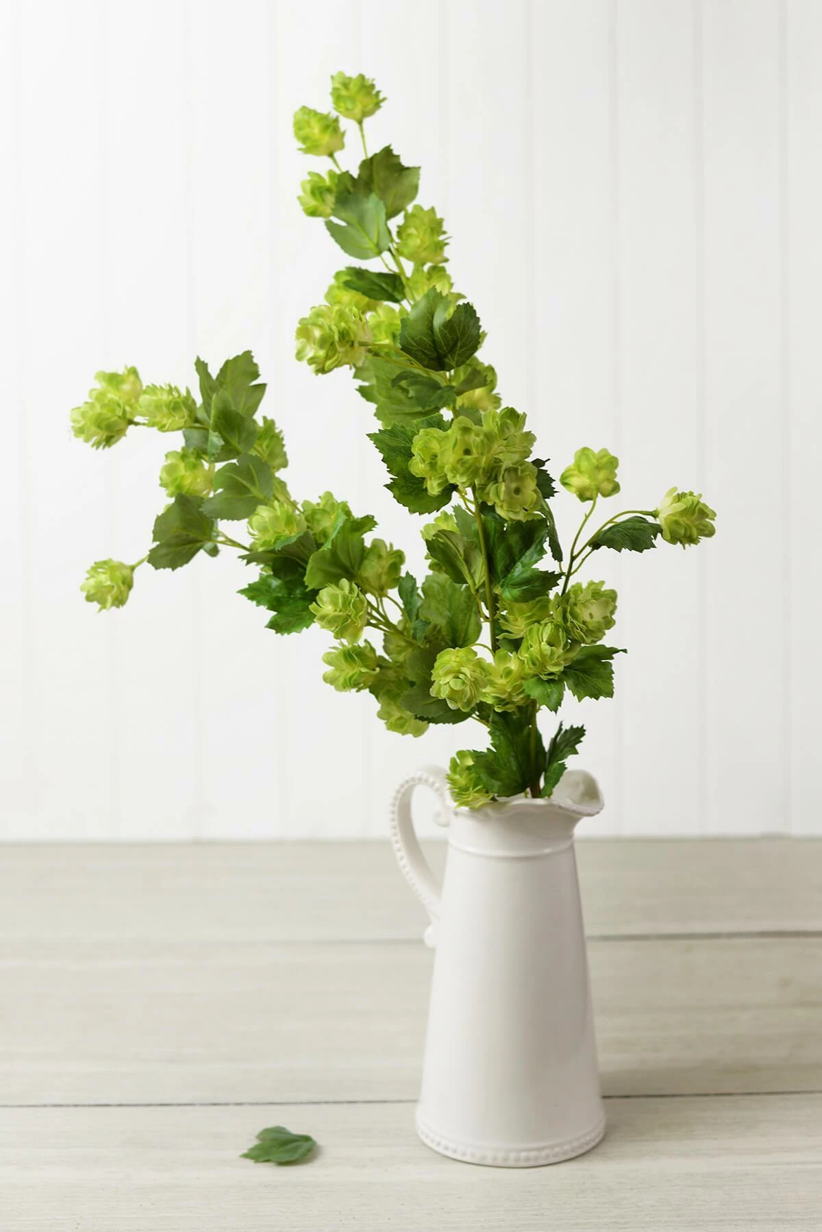 Give some green to your occasion with this Blooming Hops Spray 39″. This lush artificial blooming hops spray is filled hops and leaves made with poly silks. With hints of cream and green, this spray is beautiful on its own in a ceramic vessel; or it can easily be incorporated into arrangements with other florals. For a lush garden wedding look, use the Hops spray to decorate chair backs, add to arrangements or to adorn your wedding arbor.Â