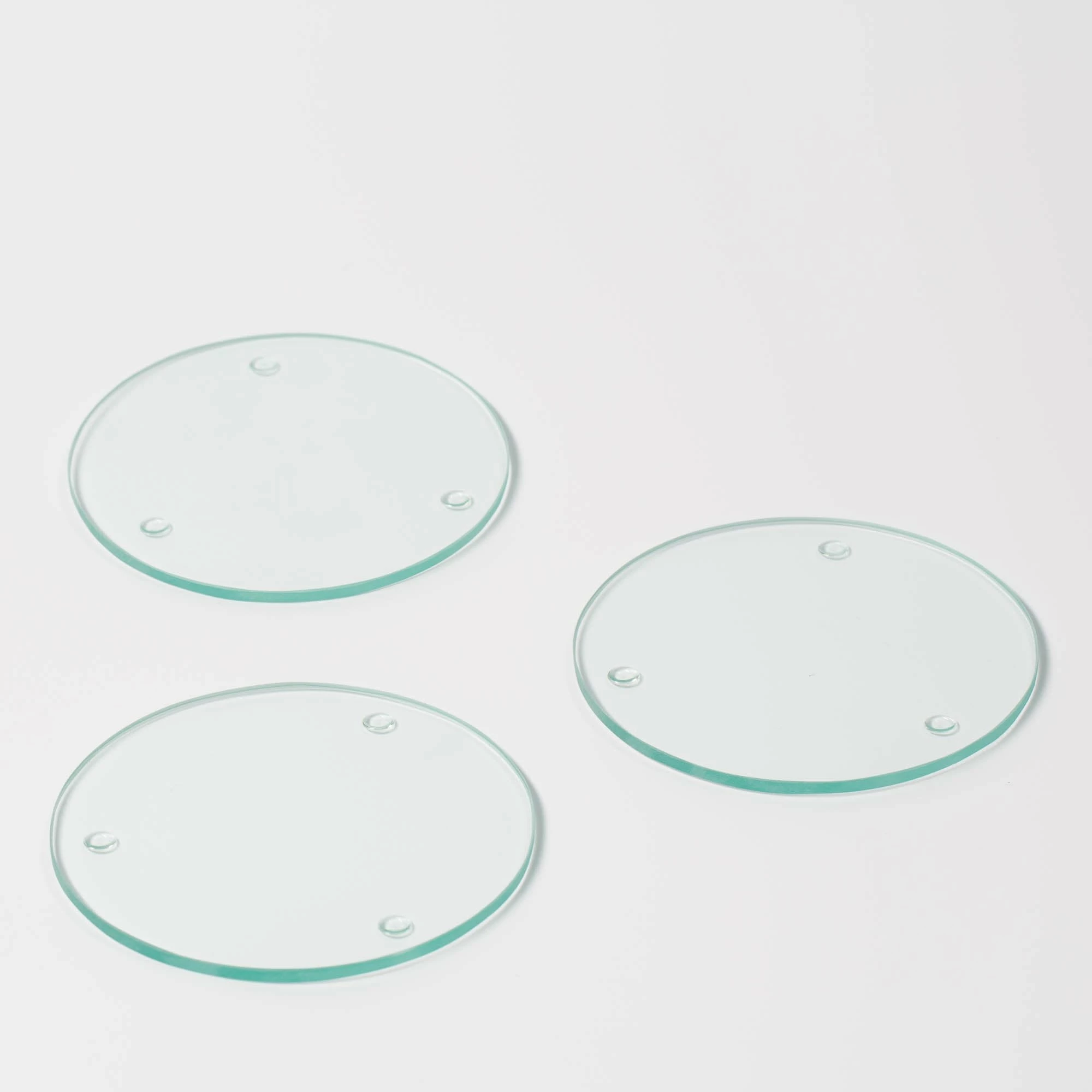 Contemporary Round Design made of clear thick glass. Easy to clean and easy to maintain. Simply wipe off nonporous surface after each use. Quality glass coasters are 1/8″ thick glass and have anti-skid feet. Coasters can be easily personalized by etching or with a marker. Eastland Coasters will protect and complement your table arrangement, while serving as a candle holder or glass holder. These Coasters make great inexpensive wedding favors or economical gifts.