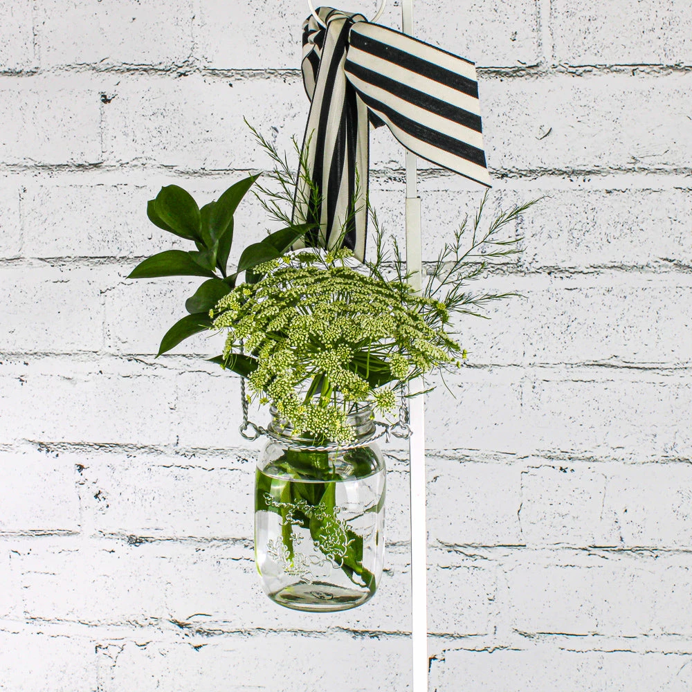 This lovely decorative glass mason jar with a braided silver metal wire handle and raised designs can be placed around your home or event space as a vase, or used as a hanging holder. This quality, thick glass jar will beautifully display fresh flowers and greenery. The raised textured design on the jar gives just the right amount on vintage flair to the piece. This set of 12 jars is sure to be a hit for weddings, outdoor entertaining, and home décor!