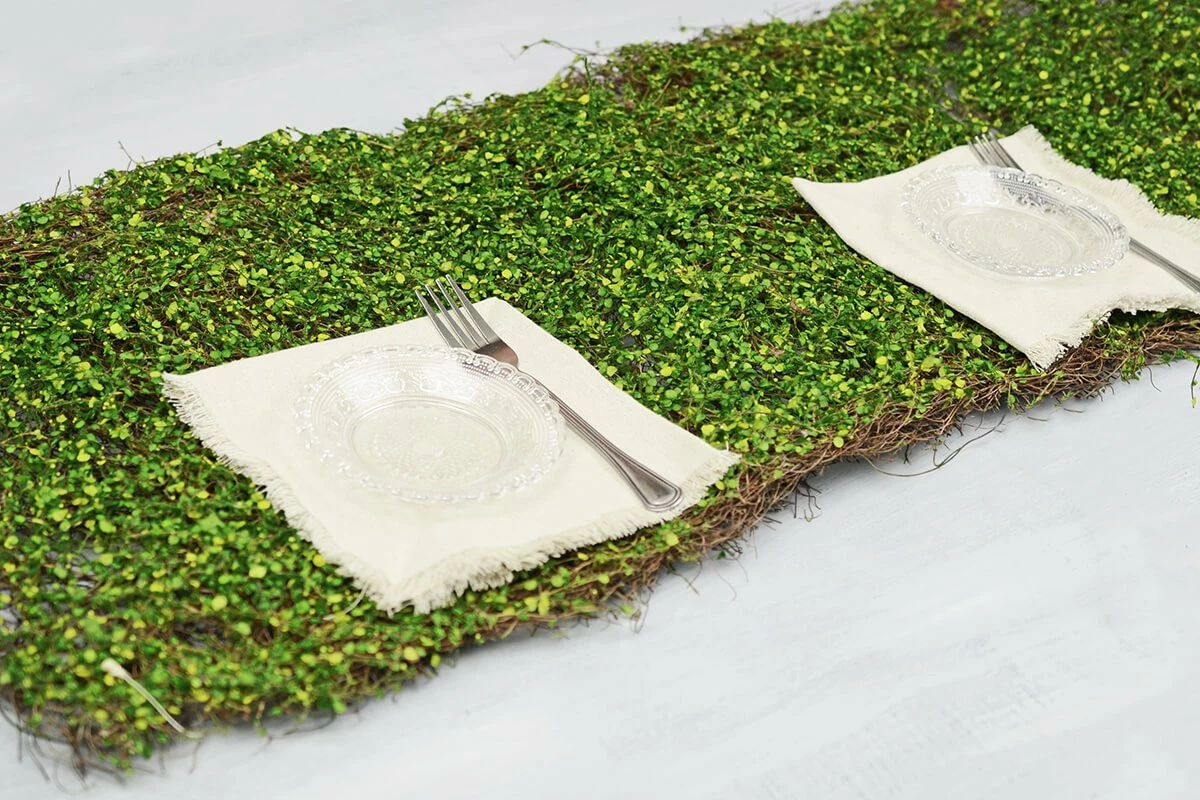 This interesting, rustic Faux Moss Leaf and Twig Mat is made to look like a lush, forest carpet. Features artificial mossy greenery detailed with curving twigs and vines for a realistic appeal. This decorative mat is great for creating whimsical woodland displays. Use as a table runner to create nature-inspired aesthetic. Fashion table centerpieces at a spring soiree by placing fresh floral vases and wooden, glass, or ceramic forest figures on top of the mat.