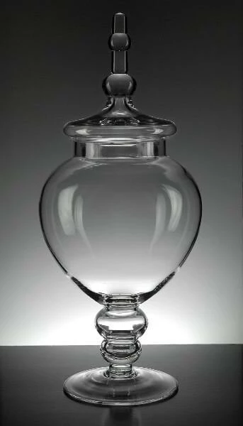 Fill this charming clear Glass Apothecary Jar 15.5” with candy or sweet treats at the favor station of your wedding reception or birthday party. Or, use the apothecary jar as an attractive storage container for your bathroom essentials such as cotton balls and small soaps. The small pedestal and unique-shaped lid of this piece creates instant elegance in any setting.Â