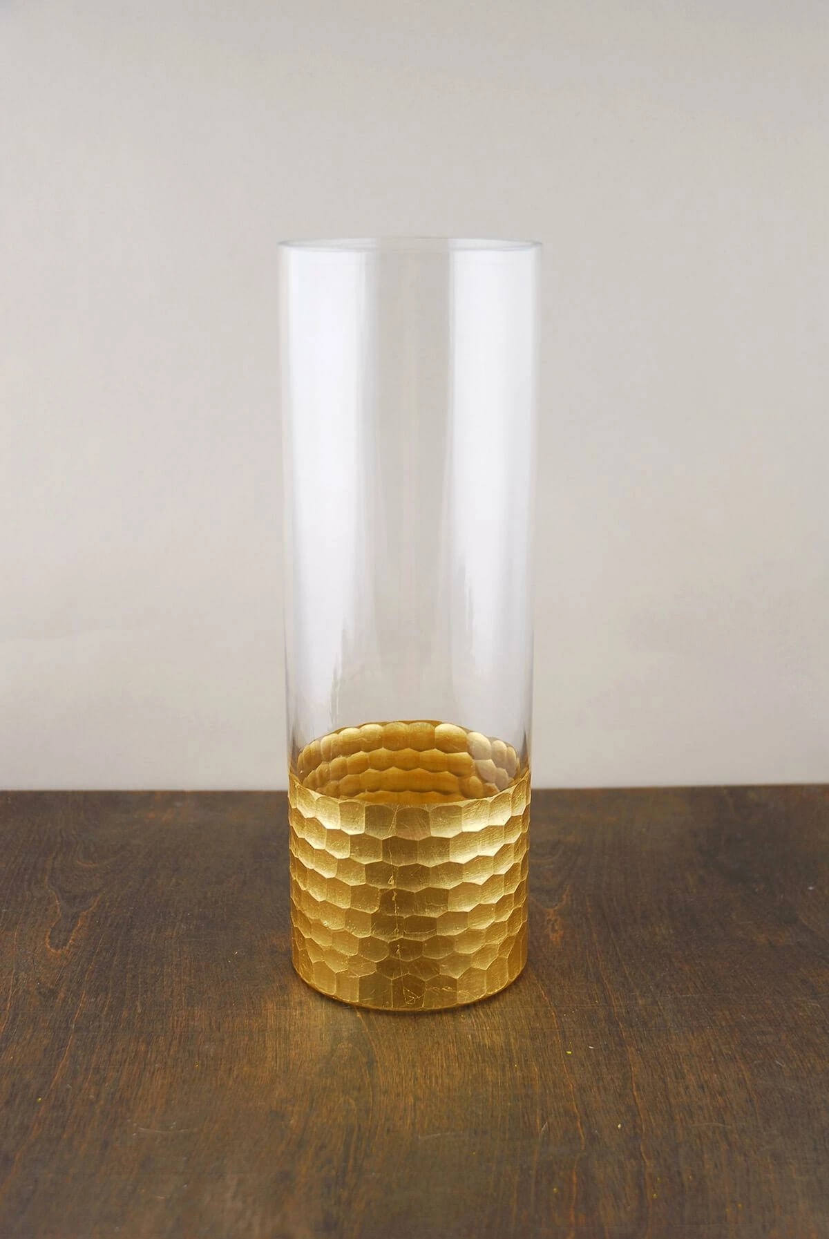 You will love this gorgeous Gold Honeycomb Cylinder Vase 12″. This versatile piece is perfect for flower arrangements or for use as a pillar or floating candle holder! This clear glass cylinder vase has contemporary styling with a dimpled honeycomb pattern around the base. This glamorous gold-dipped vase is great choice for weddings and special events; or as a lovely accent piece in your upscale home!