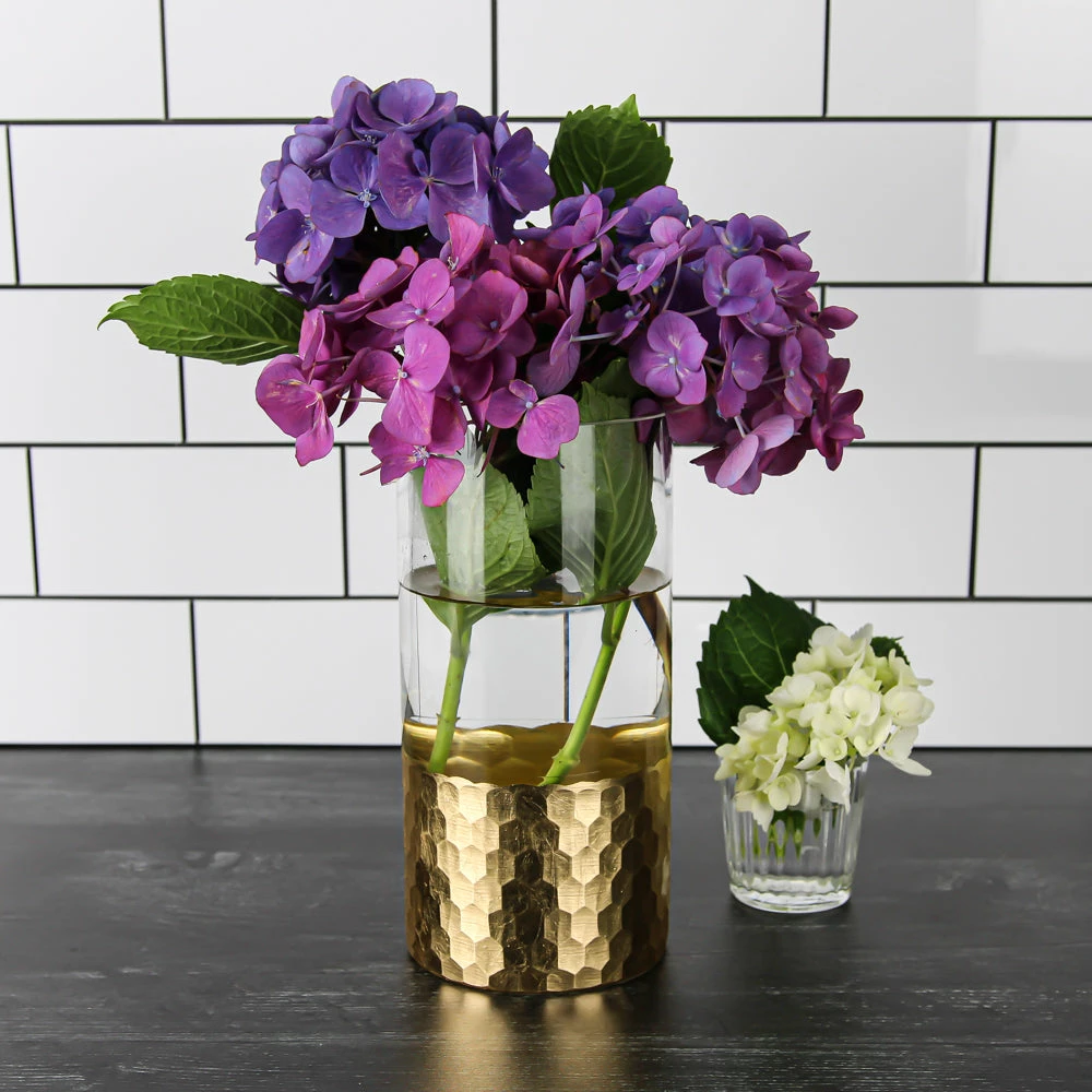 You will love this gorgeous Gold Honeycomb Cylinder Vase 8″. This versatile piece is perfect for tall flower arrangements or for use as a pillar candle holder! This clear glass cylinder vase has contemporary styling with a dimpled honeycomb pattern around the base. This glamorous gold-dipped vase is great choice for weddings and special events; or as a lovely accent piece in your home or office space!