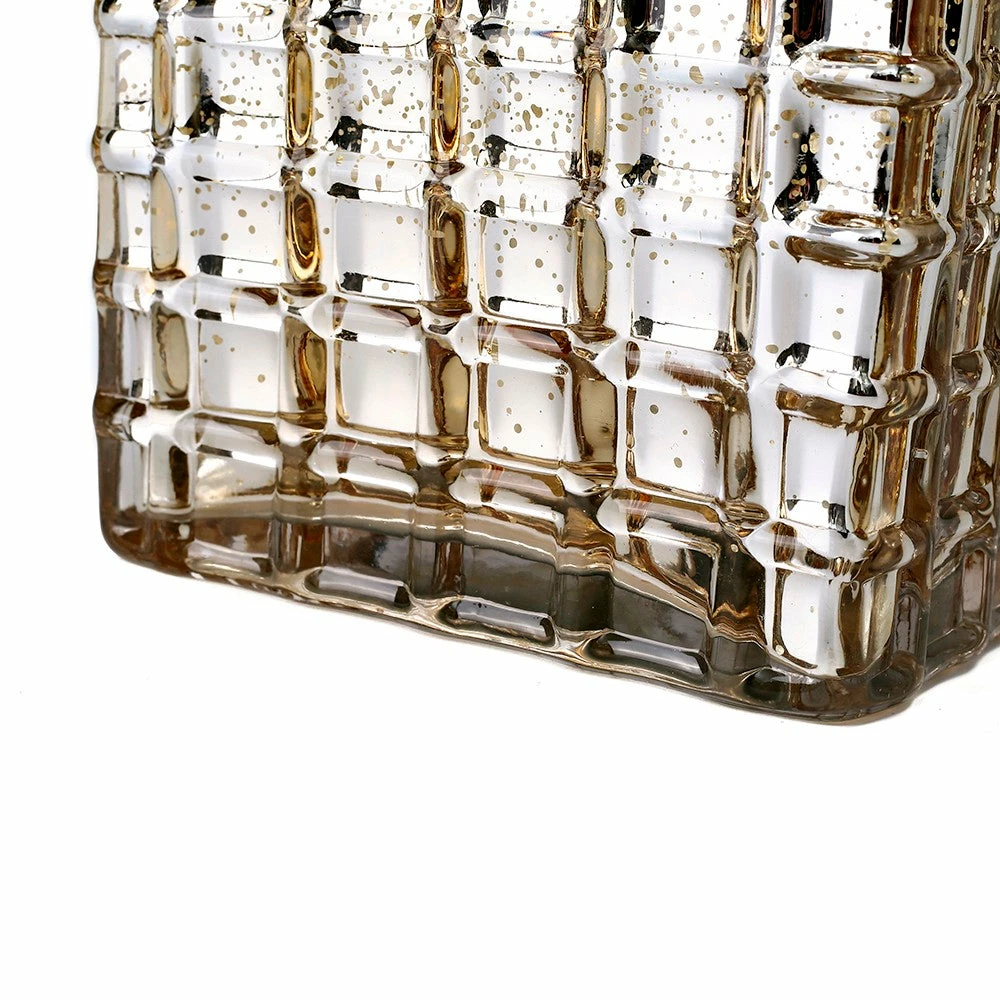 Fill this shimmering mosaic mirror effect vase with bouquets of flowers or candles to create amazing eye-catching arrangements. The sparkle of candlelight through the dappled coating will stun at your wedding or event. This dazzling Gold Mercury Textured Glass Cube 4.75″ gives off a champagne glow to illuminate its surroundings; and is perfect for modern spaces. Set the stage for a spectacular display of flaxen, reflective light with this piece. This holder is textured in a square pattern and features a speckled mercury finish.Â
