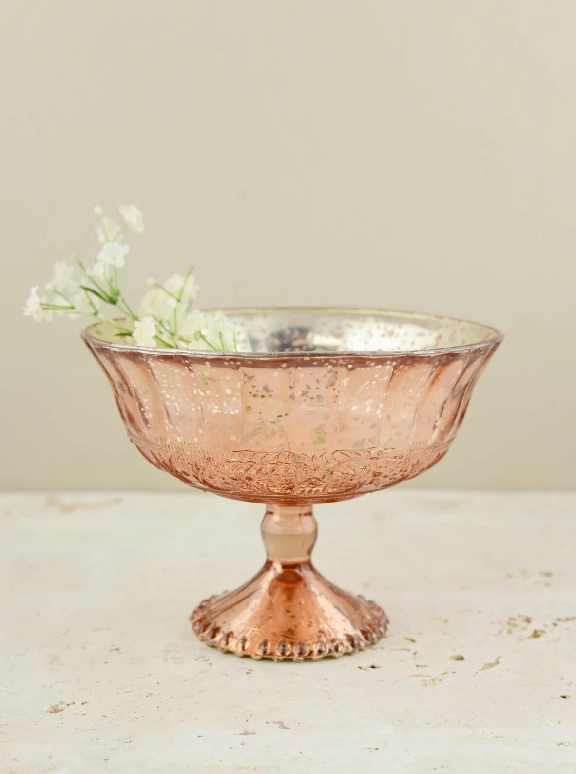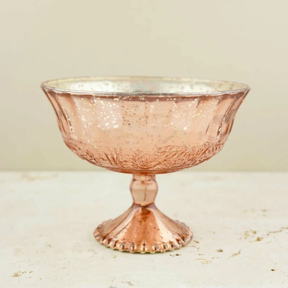 Showcase your floral arrangements in this striking Mercury Glass Compote in Rose Gold 7×5.25! The blush pink/copper mercury style finish compote with silver interior features a slightly scalloped top and beaded detail around the base. This elegant glass compote is coated on the inside with metallic paint to give it a speckled appearance that is perfect for accentuating vintage décor and glamorous events. Perfect for weddings, special events, and dinner parties!