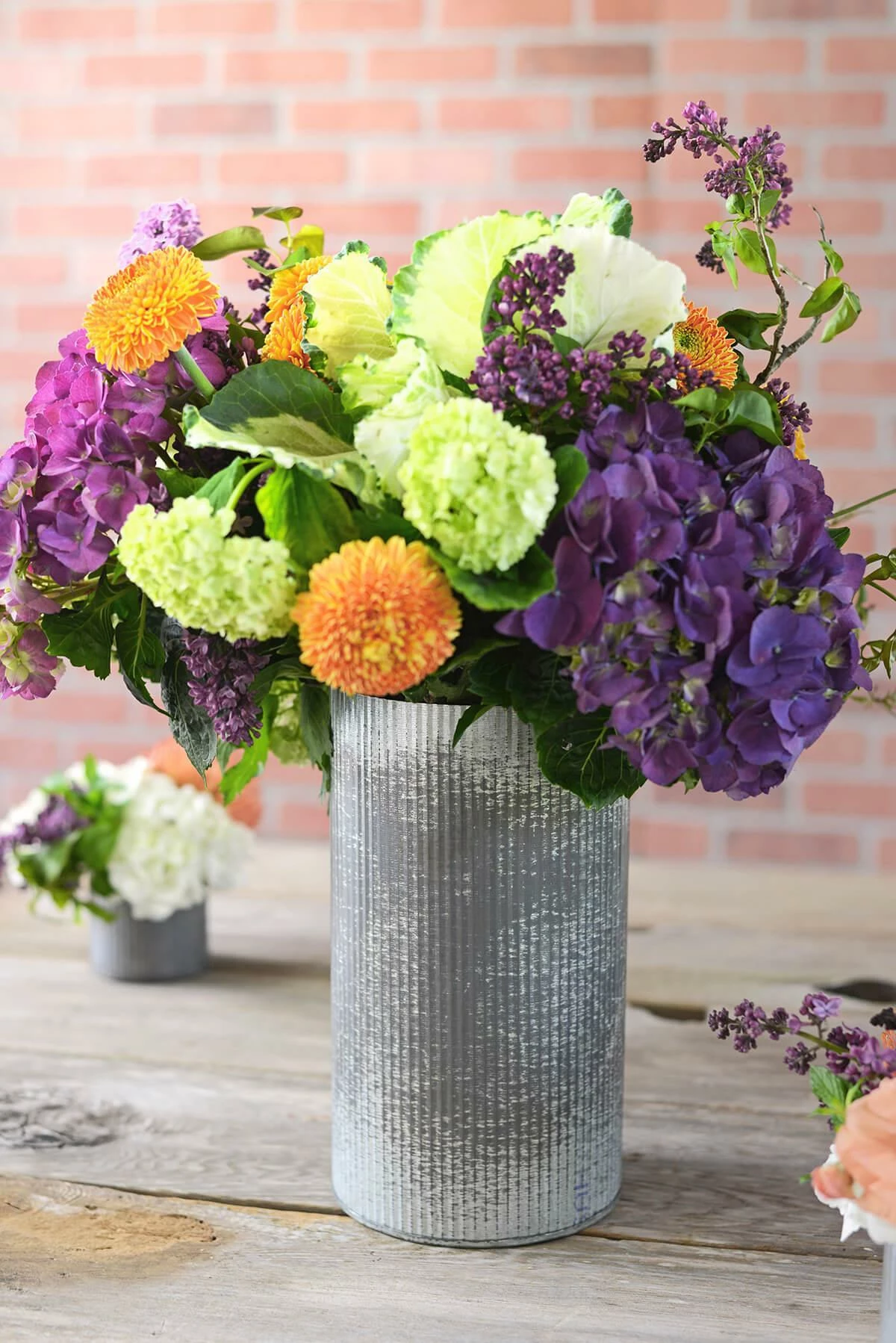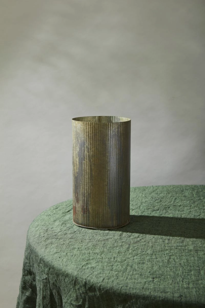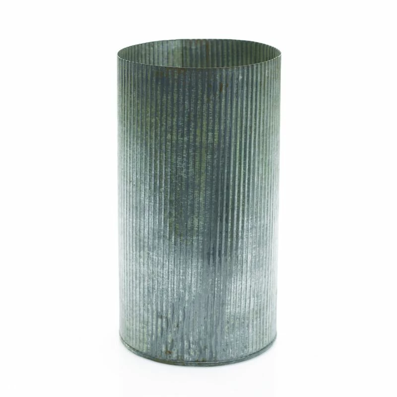 This rustic zinc container contrasts yet shows off the softness of floral arrangements and greenery in a lovely and interesting way that will surely impress at your event or in your home. The Norah Corrugated Zinc Vase 10.5″ adds an instant industrial flair to centerpieces and vignettes; making it an excellent accent to modern and rustic decor schemes. This vase is made of corrugated zinc and has a distressed finish/texture. This antiqued metal vase/pot would be perfect for an outdoor party or modern patio!   The unique patina effect on each item creates an one of a kind beauty to every piece.