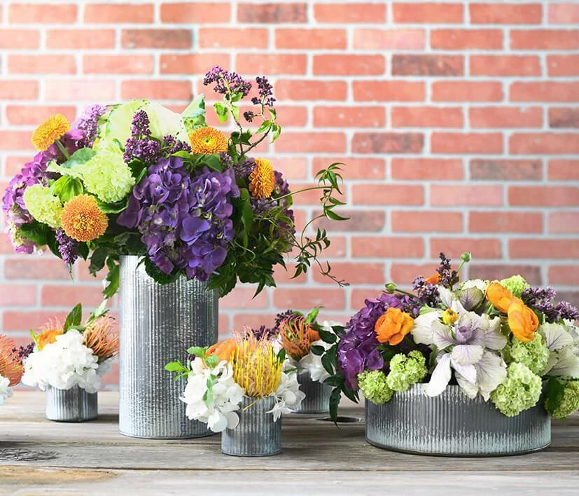 Add some industrial flair to floral beauty with this Norah Corrugated Zinc Vase 7″. This medium-size zinc vase has a rustic finish and is corrugated metal material. This rustic zinc container contrasts yet shows off the softness of floral arrangements and greenery in a lovely and interesting way that will surely impress your guests. Perfect for an outdoor event or modern patio!   The unique patina effect on each item creates an one of a kind beauty to every piece.