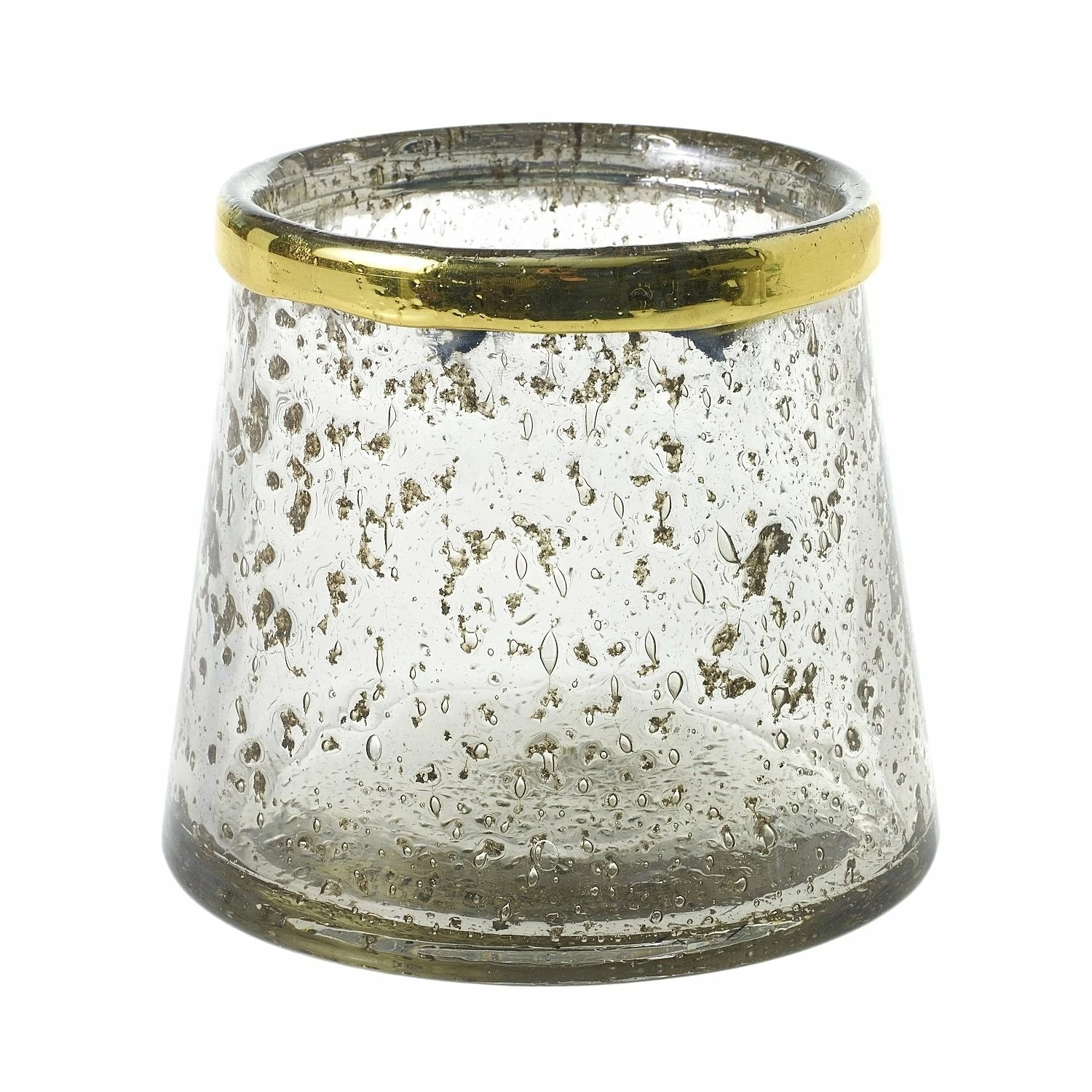 The Chance Candle Holder 4.5″, with its thick rolled bubble glass and elegant gold rim brings understated sparkle to every event or tabletop. This sturdy piece also serves well as a vase for flowers or greenery. This piece is sure to provide a stunning impression wherever you decide to use it.Â