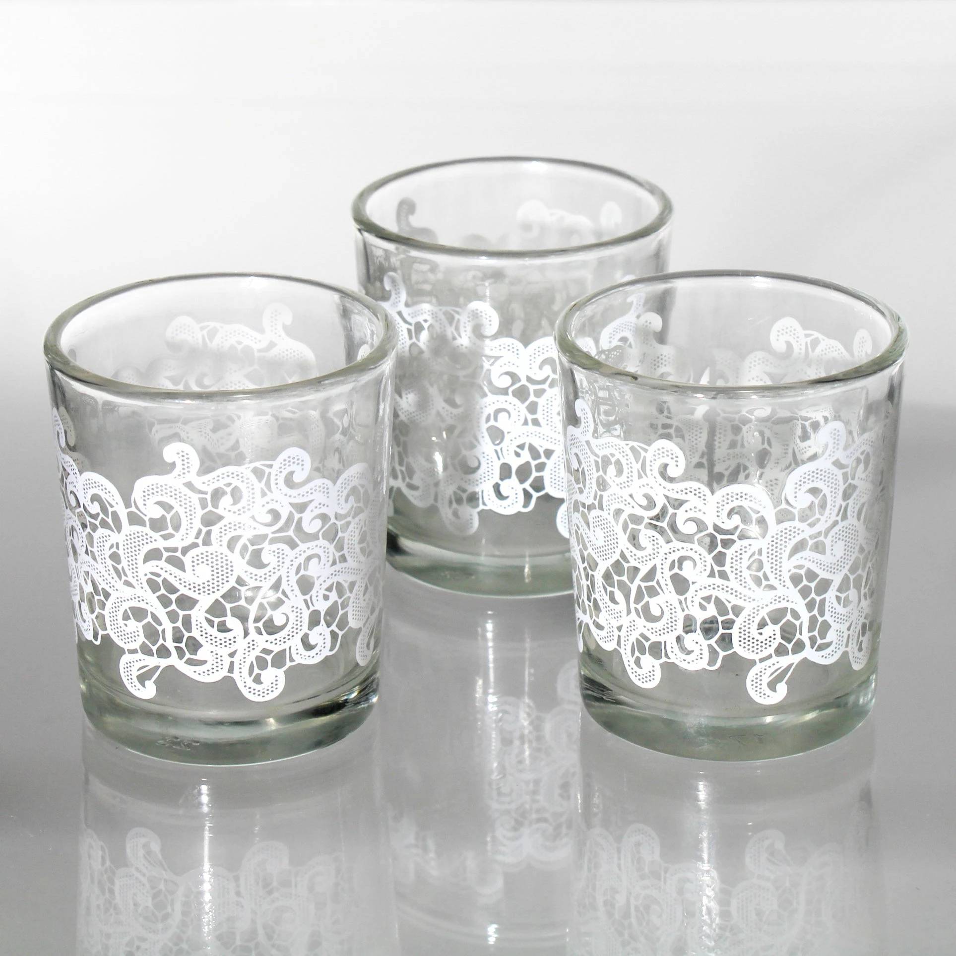 Dream Away with our Clouds Lace Design Votive Holder! The white clouds lace design decal on a clear glass votive holder adds a dreamy touch to your décor. Intensify the cloud design by adding your favorite colored votive candle inside. With a candle added to this lovely holder, the glow that twinkles through the airy lace design will add instant ambiance to any setting. Pair with our Richland Tealight or Votive Candles to complete your look. Perfect for weddings and events!Â