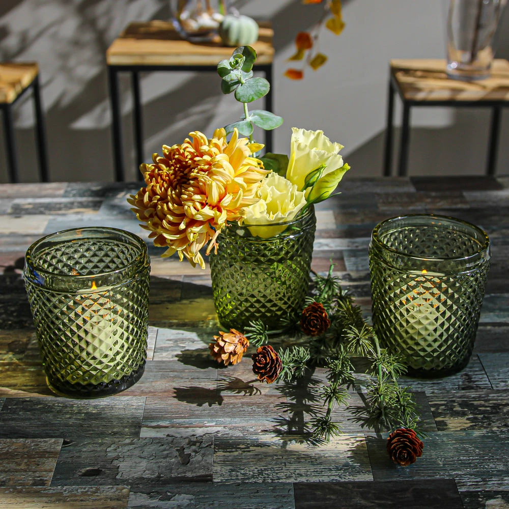 Brilliant! With a tealight or votive candle inside, the effect of candlelight through this olive green patterned holder is stunning. The raised diamond detail in the thick glass creates a different ambiance from angle to angle that everyone will love – great for special events, restaurants, and in the home! Fill with your favorite flowers for a charming flower vase!