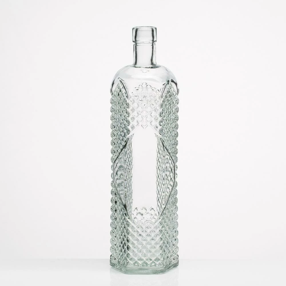 This tall hexagonal Richland Glass Textured Bottle has all the attributes to make a true statement maker! Featuring six textured sides, interesting shapes, and thick sturdy clear glass, this vase is sure to add intrigue to any area. Use this beauty as a vase for your favorite blooms or find other ways to incorporate into your design. Adding candlelight around this bottle will instantly make this vase sparkle with the angled design glistening in the glow. Use your imagination to make this bottle an instant favorite in your décor!