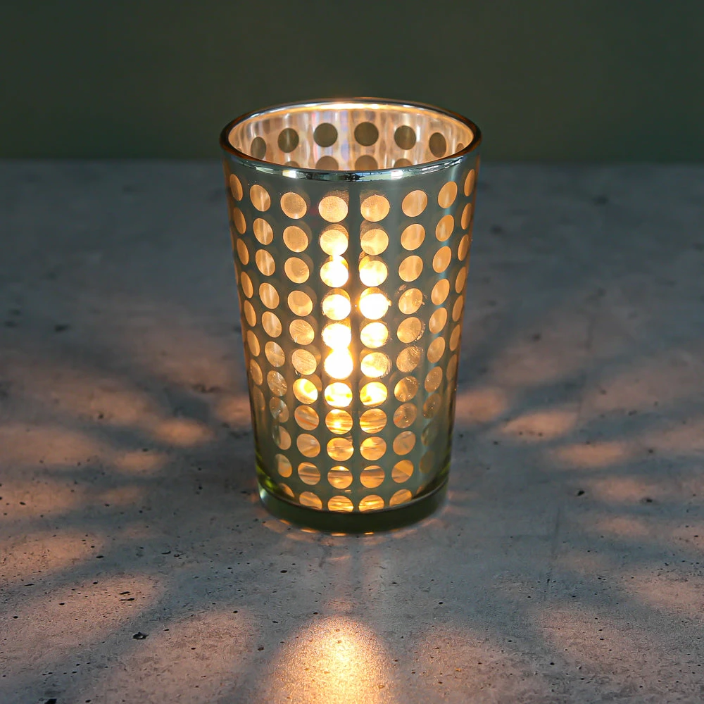 Metallics are in! Our fabulous line of silver, gold, and rose gold metallic glass holders will make your home or event a little more magical. This tall and narrow holder features quality glass, a gold metallic dotted design, and elegant tapered shape. Add our Richland Votive or Tealight Candle options to complete your look (candles not included). Candlelight illuminates the holder, providing a captivating glow through the dots of the design.