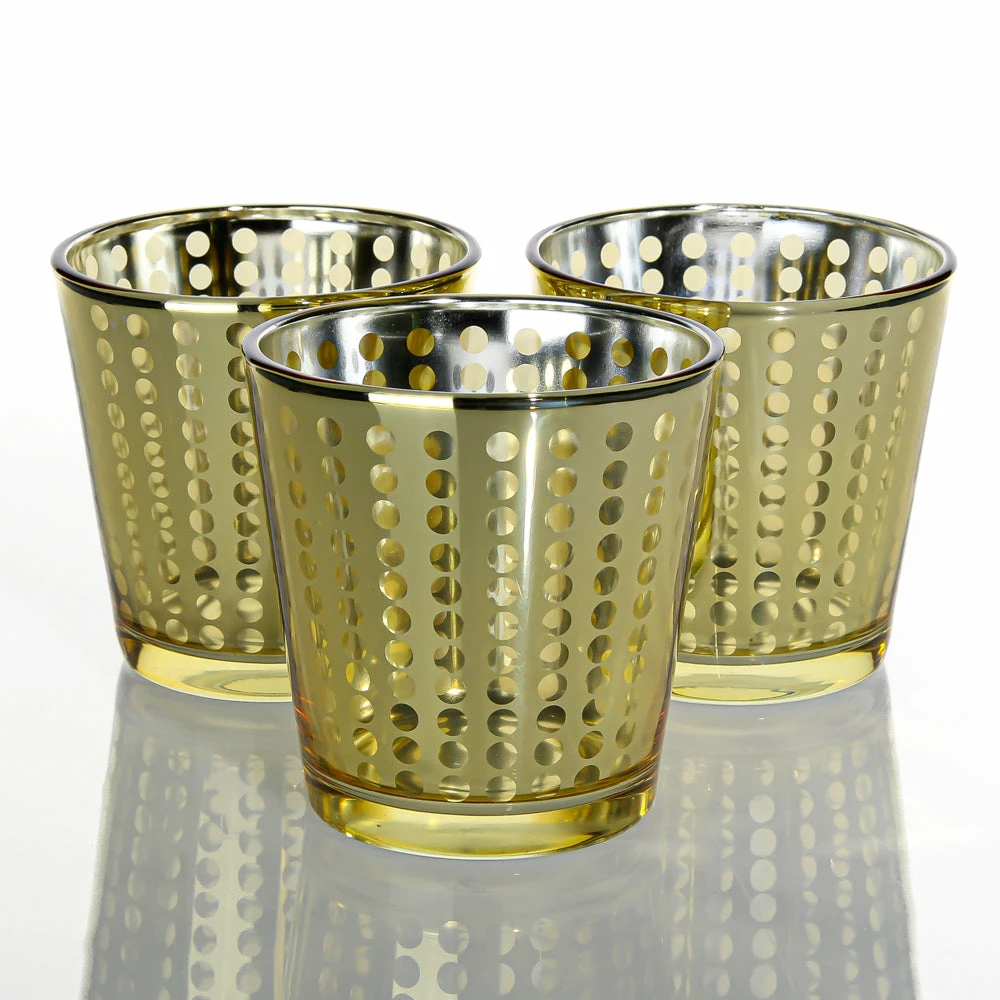 Metallics are in! Our fabulous line of silver, gold, and rose gold metallic glass holders will make your home or event a little more magical. This medium size holder features quality clear glass with an added gold metallic dotted design and tapered shape. Add our Richland Votive or Tealight Candle options to complete your look (candles not included). The candlelight shining through the dots of the design creates an amazing ambiance on tables and surfaces.Â