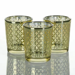 Metallics are in! Our fabulous line of silver, gold, and rose gold metallic glass holders will make your home or event a little more magical. This round clear glass holder with added gold metallic lattice design and slight taper perfectly fits our Richland Votive Candles or any of our Richland Tealight Candle options (candles not included). Candlelight twinkling through the lattice design creates an amazing ambiance on tables and surfaces.Â