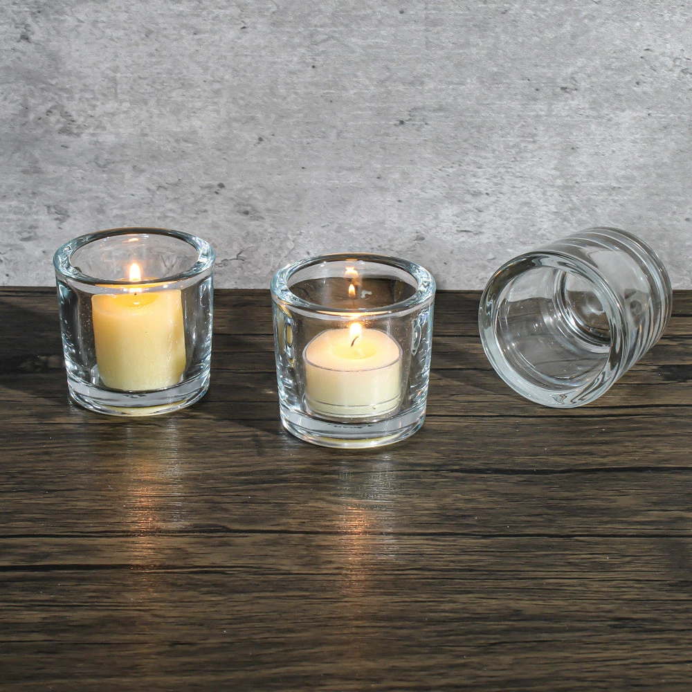 Looking for a more robust, yet classic candle holder option? Then this large tealight or votive glass holder is for you! At about 1/4″, the sturdy and durable glass of this holder is simple in style, yet elegant when filled with your favorite candle. The quality of this extra thick glass holder with dense sham paired with its amazing price make it an excellent choice for home or event use. This piece is also a great way to present candies or small succulents as party favors.