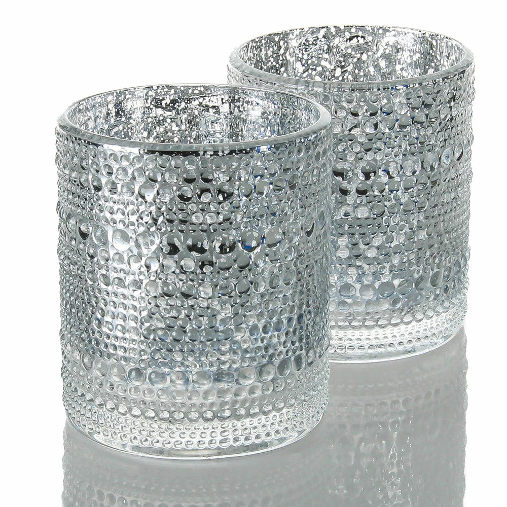 Perfection! This metallic silver glass holder is full of gorgeous pearl size rounds in multiple sizes to create the most magical and stunning effect. The shine combines with the raised pearl shapes for a textured look that will stun in any setting. When candlelight is added, a lovely shimmery glow is created from the inside out. The size is perfect that just a few on each table would impress; and many lining a long table would blow your guests away! Great for weddings, special events, restaurants, and home décor!
