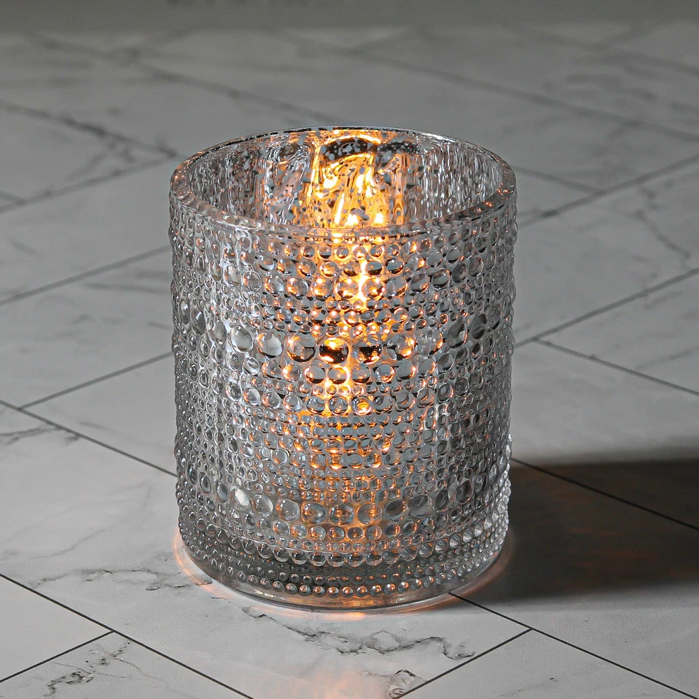 Perfection! This metallic silver glass holder is full of gorgeous pearl size rounds in multiple sizes to create the most magical and stunning effect. The shine combines with the raised pearl shapes for a textured look that will stun in any setting. When candlelight is added, a lovely shimmery glow is created from the inside out. The size is perfect that just a few on each table would impress; and many lining a long table would blow your guests away! Great for weddings, special events, restaurants, and home décor!
