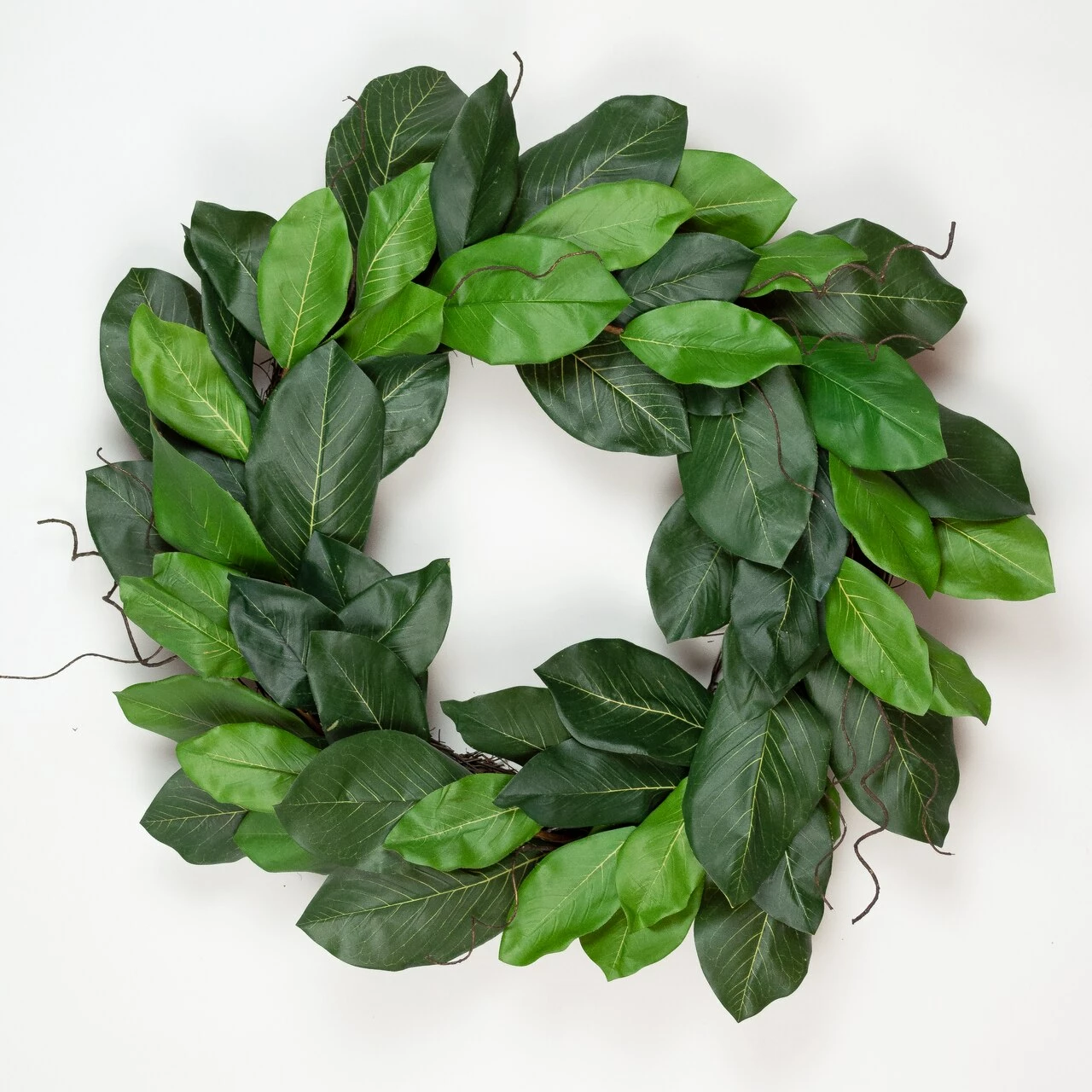 Add this leafy green Mountain Magnolia wreath to your next home decor project for a elegant, simple look. This wreath is filled with deep and light shades of artificial green leaves accented with vine and tied together on a vine base.