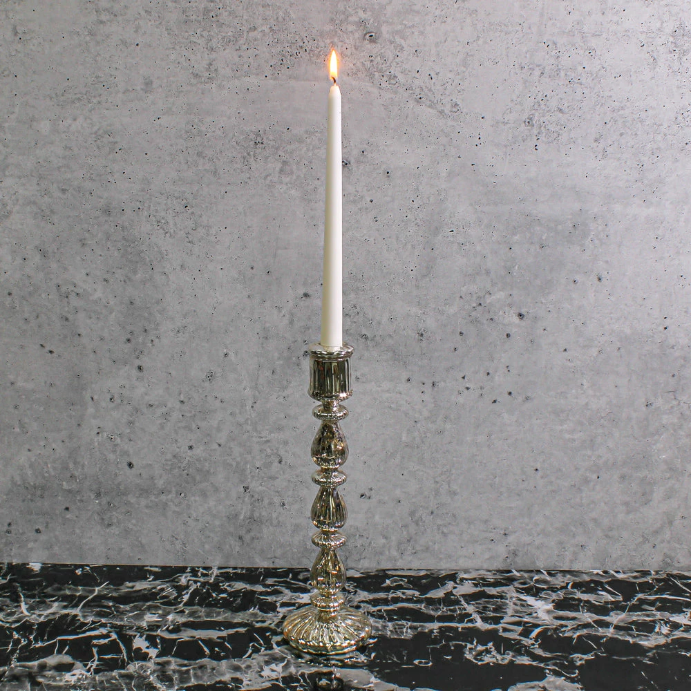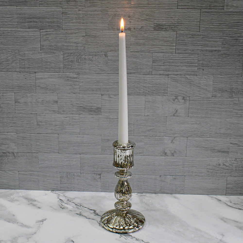 The perfect holders to showcase your taper candles! This set of streamlined ribbed mercury glass holders will beautifully house taper candles. The taper candles will become an extension of the delicate holders to create a gorgeous glow in any setting. The way light bounces off the ribbed sides and speckled mercury finish makes these holders a favorite for events and home décor. This set includes one of each size holder for a perfect tiered centerpiece.Â