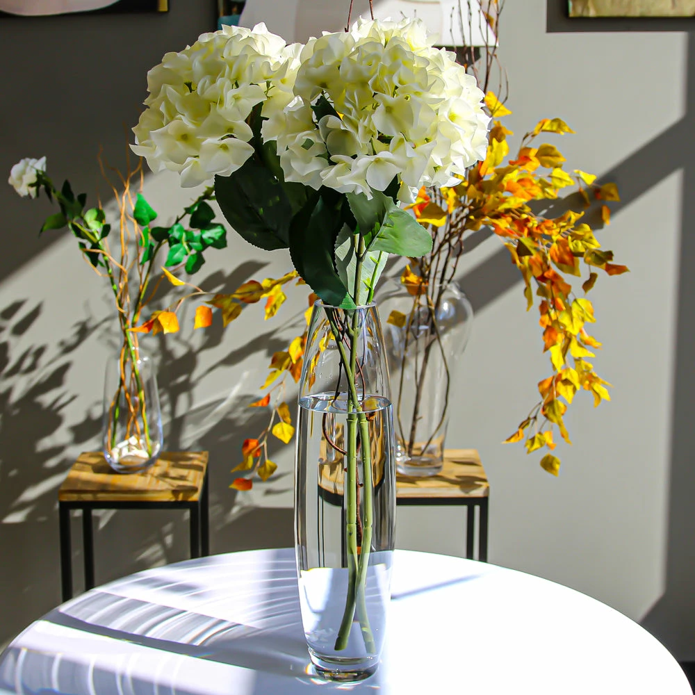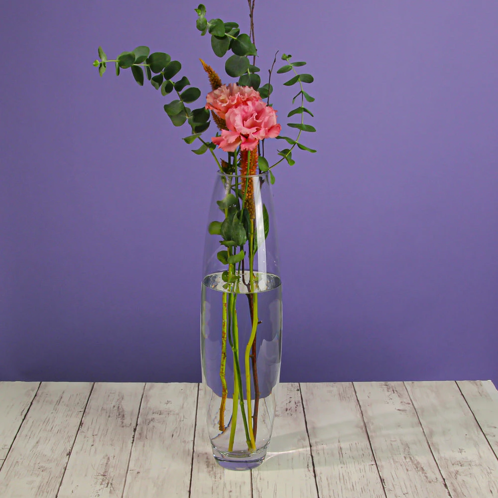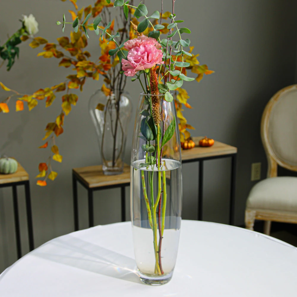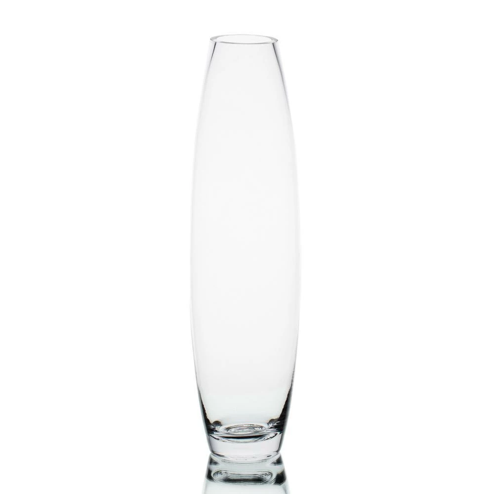 Our Rosalie is a beauty! She is tall and chic like a classic cylinder; but she features a unique quality in her elongated oval shape. The handblown clear glass and thick sham of the Rosalie makes it perfect for displaying twigs, long stem floral sprays, or flowering branches. Create breathtaking and stately arrangements with this statuesque piece. In centerpieces, this vase will WOW the guests of your wedding or event. Or, use to instantly upgrade your home or office décor.