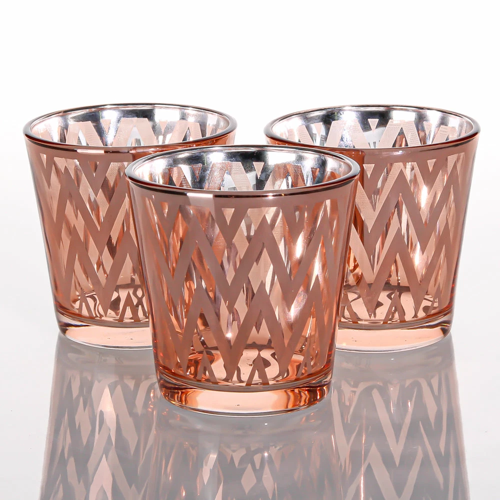 Metallics are in! Our fabulous line of silver, gold, and rose gold metallic glass holders will make your home or event a little more magical. This medium size holder features quality glass, a rose gold metallic chevron design, and tapered shape. Add our Richland Votive or Tealight Candle options to complete your look (candles not included). Candlelight zigs and zags through the design to create a captivating ambiance on tables and surfaces.