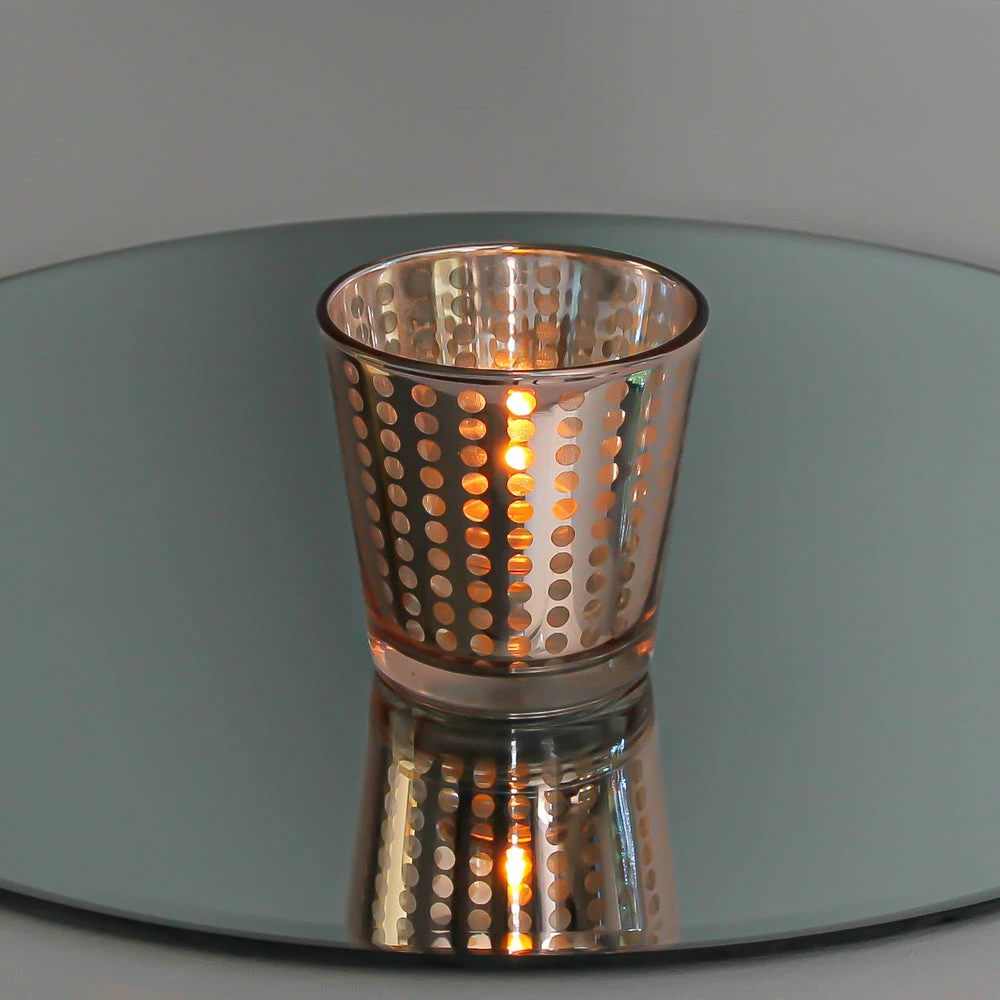Metallics are in! Our fabulous line of silver, gold, and rose gold metallic glass holders will make your home or event a little more magical. This medium size holder features quality glass, a rose gold metallic dotted design, and tapered shape. Add our Richland Votive or Tealight Candle options to complete your look (candles not included). The candlelight shining through the dots of the design creates an amazing ambiance on tables and surfaces. Not dishwasher or detergent soap safe.