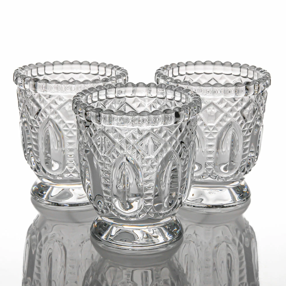 A smaller version of a customer favorite! This regal and romantic holder with beaded edge gives you a glimpse of a vintage tea room. The raised textured facets of the glass beckon the feel of jewels. With these many angles and shapes in the design and thick base, candle light dances about and creates a lovely ambiance. This beautiful royal holder is an excellent choice to add some glamour at a Wedding, Restaurant, Event, or Dinner Party!Â