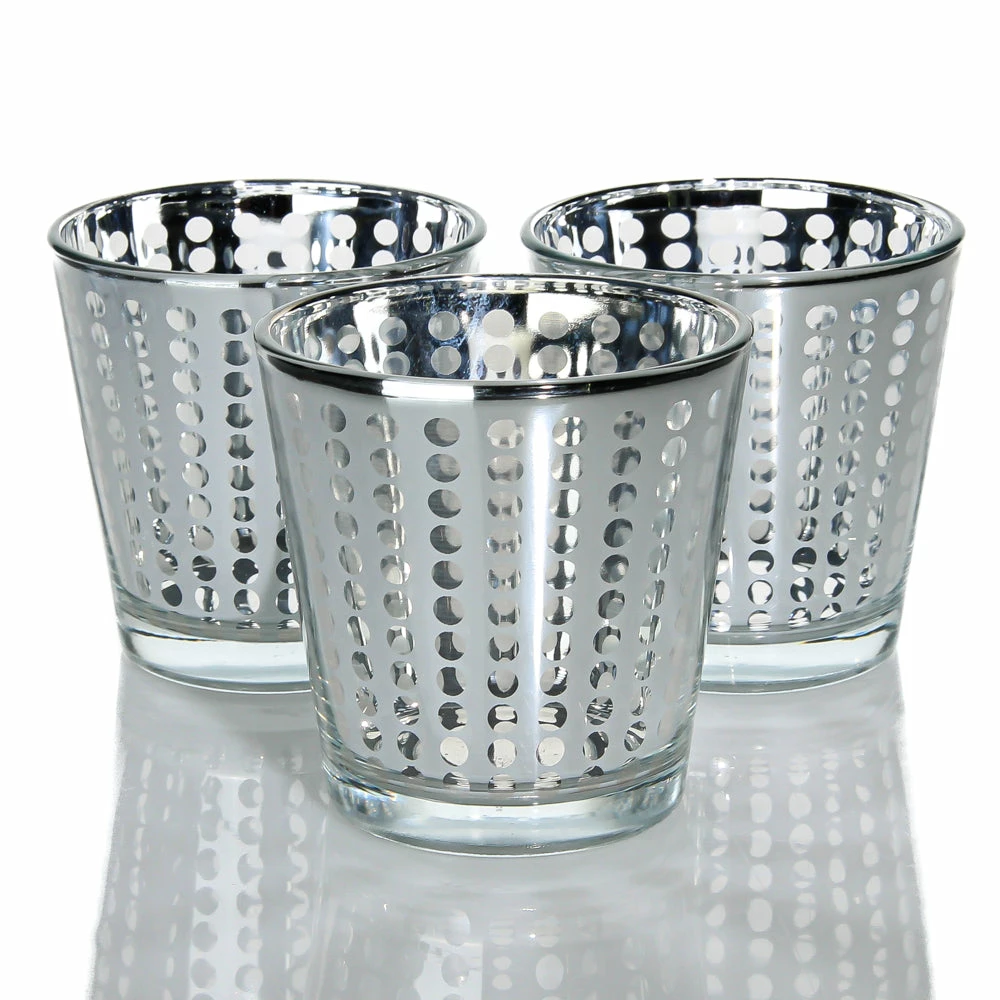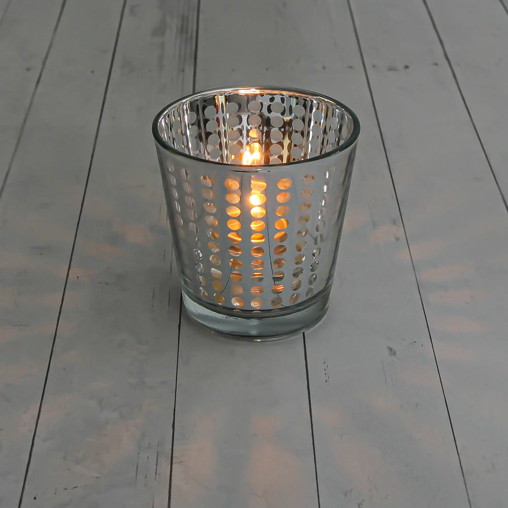 Metallics are in! Our fabulous line of silver, gold, and rose gold metallic glass holders will make your home or event a little more magical. This medium size holder features quality glass, a silver metallic dotted design, and tapered shape. Add our Richland Votive or Tealight Candle options to complete your look (candles not included). The candlelight shining through the dots of the design creates an amazing ambiance on tables and surfaces. Not dishwasher or detergent soap safe.Â
