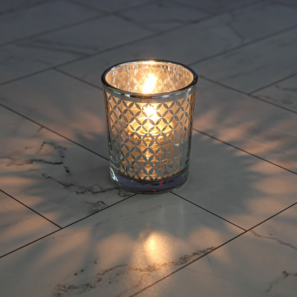 Metallics are in! Our fabulous line of silver, gold, and rose gold metallic glass holders will make your home or event a little more magical. This round clear glass holder with added silver metallic lattice design and slight taper perfectly fits our Richland Votive Candles or any of our Richland Tealight Candle options (candles not included). Candlelight twinkling through the lattice design creates an amazing ambiance on tables and surfaces.Â
