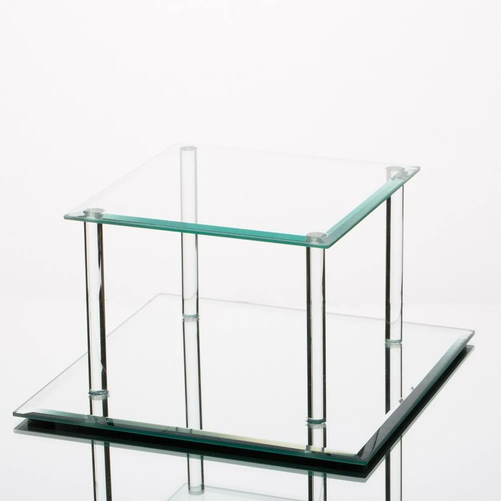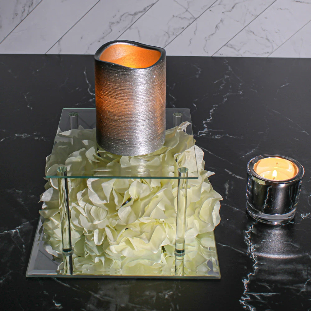 Elegant elevation! Take your centerpieces to a whole new level with this 2-tiered stand. Adding candles, bud vases or other trinkets will up the beauty in your home or event. The top tier is made of a beautiful clear, thick glass, and the bottom tier is a gorgeous mirror. The beveled edges on both tiers and clear glass columns add additional prestige. Great for modern, crisp designs and spaces.Â