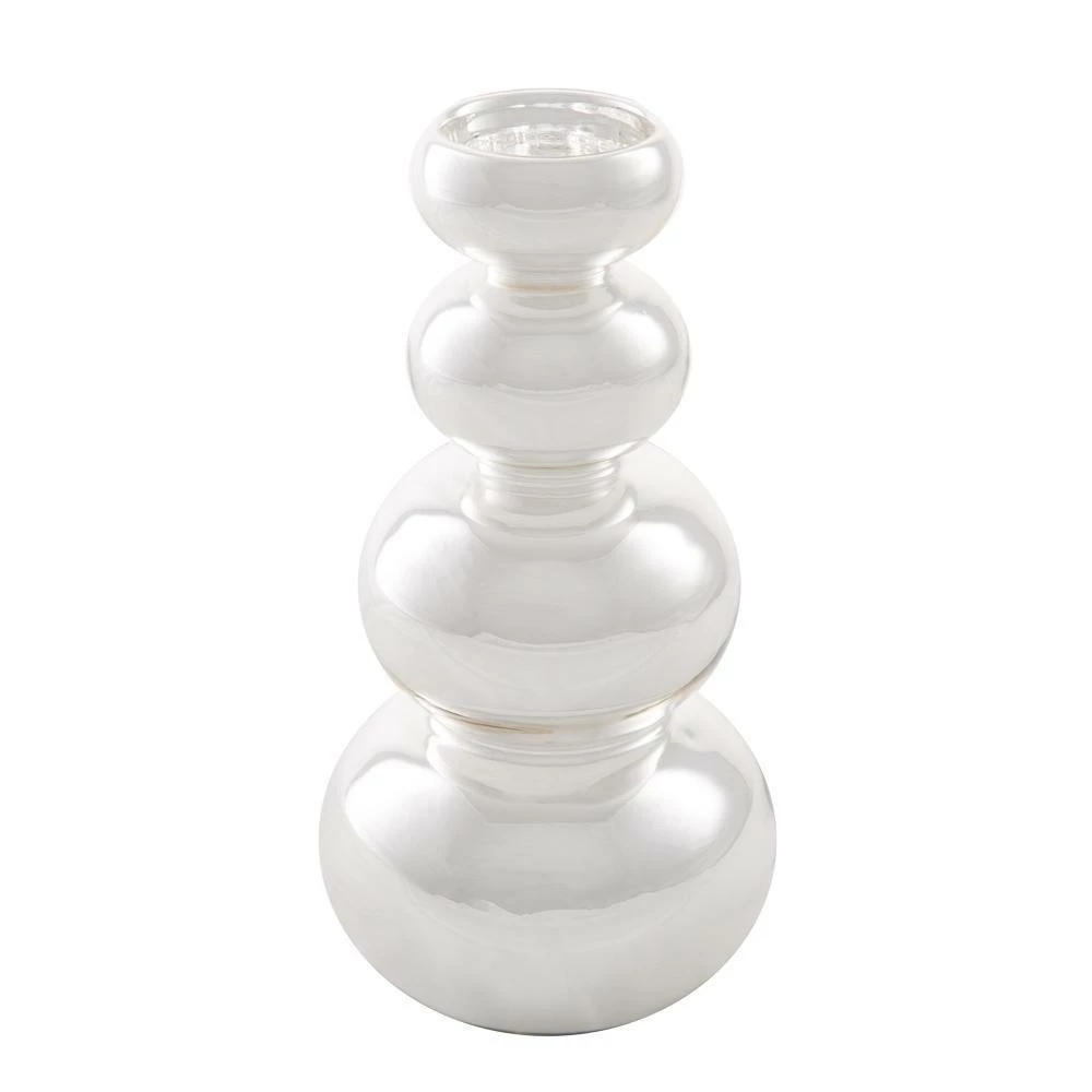 Metallic and Mod! This bubble shaped glass tealight holder is a gorgeous mod-inspired accent for your décor. The whimsical design and reflective mirrored finish of this piece makes an impression and creates visual interest in centerpieces and displays. Just add our Richland Tealight Candles in the convenient slot at the top; and and admire the glow! Both our real and LED tealights work for this holder. Great for events and home décor.