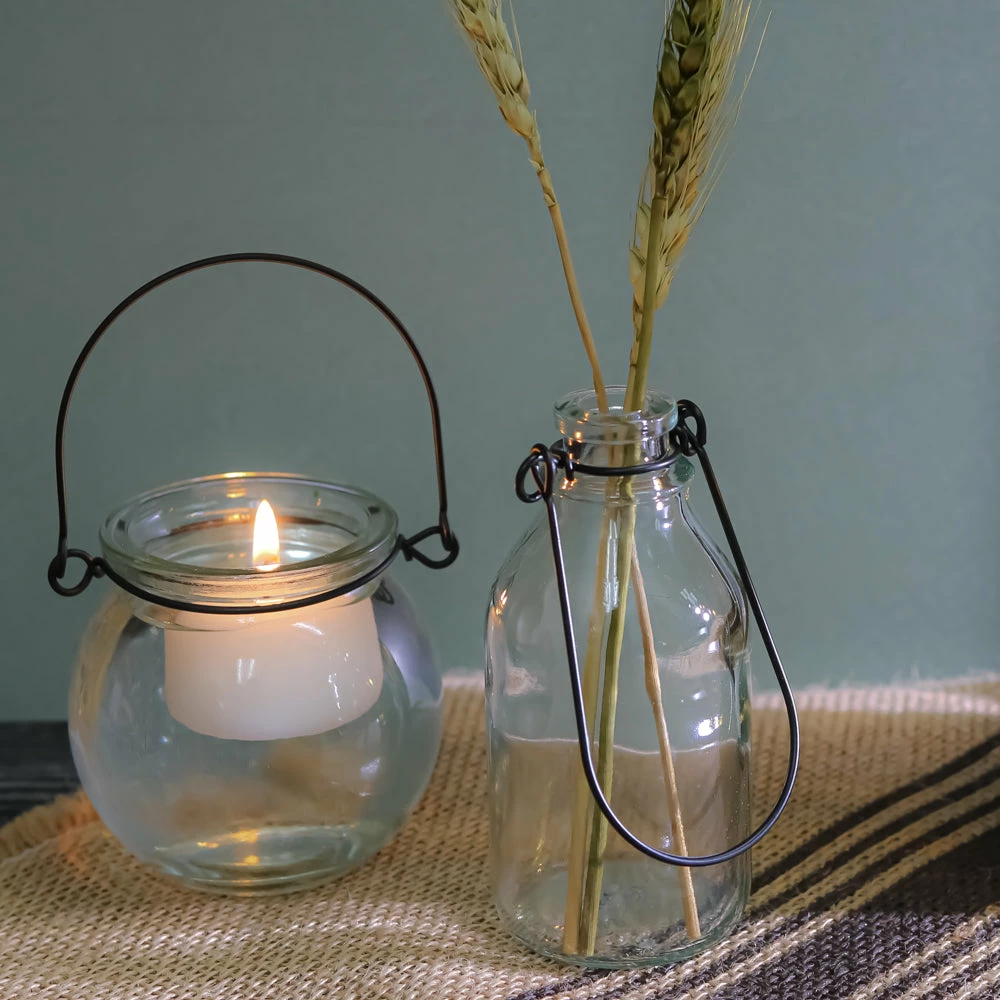 Who doesn’t love a miniature milk bottle vase? This darling clear glass bottle vase features a simple and sturdy black metal handle that allows you to hang it anywhere you like. This small vintage style piece with raised “100” marking on the glass is a warm reminder of the past. Such a great way to showcase your favorite small flower for events, home décor, and gifts! Place in a vignette or centerpiece; or display blooms wherever you like!