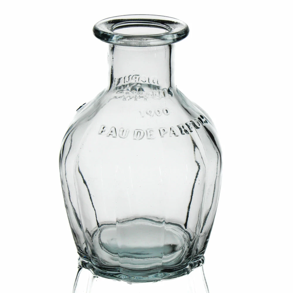 With its reminiscent charm and quality thick glass, this decorative glass bottle is the perfect display vessel for fresh florals! This antique-inspired clear glass vase features a ribbed rounded body that leads into an elegant narrow neck and bold top lip. The vase channels the beauty of old-time perfume bottles with raised text that reads DEPUIS 1900 EAU DE PARFUM; making it a statement piece on its own.