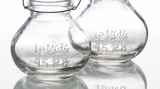 A perfect hanging mini vase! This petite thick clear glass vase with simple raised etched text provides the perfect vintage flair. This adorable jar features a curved shape a simple, sturdy black metal handle that allows you to hang it anywhere you like. The text on the little jar reads: Le MÃdà 15.R8