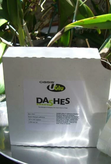 Oasis UGlu Dashes. One thousand 1/2in x 5/8in adhesive dashes on a roll. OASIS UGlu Adhesive Dashes bond to all types of surfaces . Especially helpful when attaching flowers to branches and diamond wrap to glass vases! And it is easy to remove. Use on any rough surface, such as baskets and natural branches. Bonds instantly to: glass, plastics, metal, fabric, wood and more. Non toxic, acid free, waterproof and weather resistant. You are going to love how easy it is to attach ribbon, crystals, fresh flowers to just about anything.